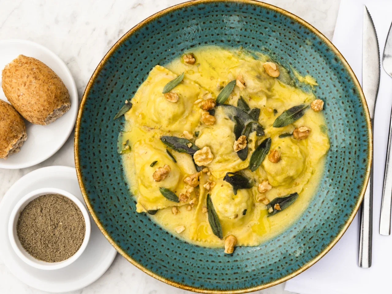 - Домашние равиоли со шпинатом, желтком и соусом из икры