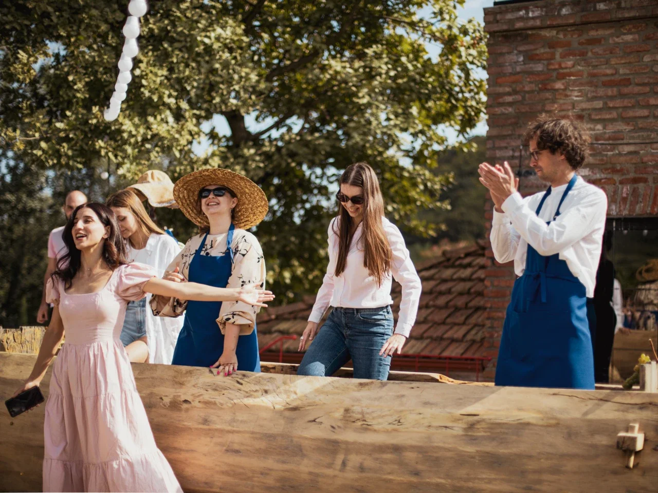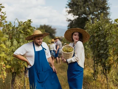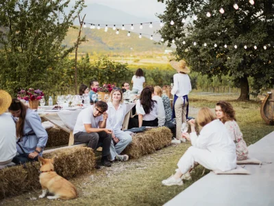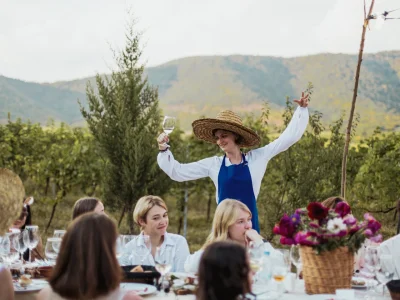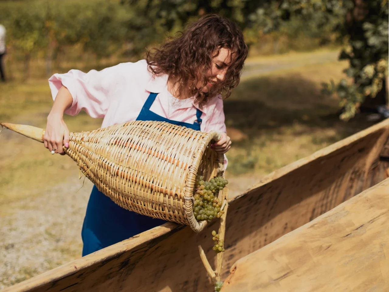 Начнем день эстетичным пикником с бокальчиком игристого прямо на плантации. Вооружимся секаторами, корзинами и отправимся собирать урожай. Дальше мы проследуем на винодельню, где увидим и примем участие во всех этапах. Танцы в стиле Челентано тоже будут — это уже неотъемлемая часть Ртвели.