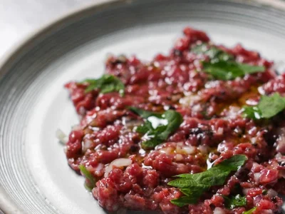 — подкопченый тар-тар из говядины с каперсами